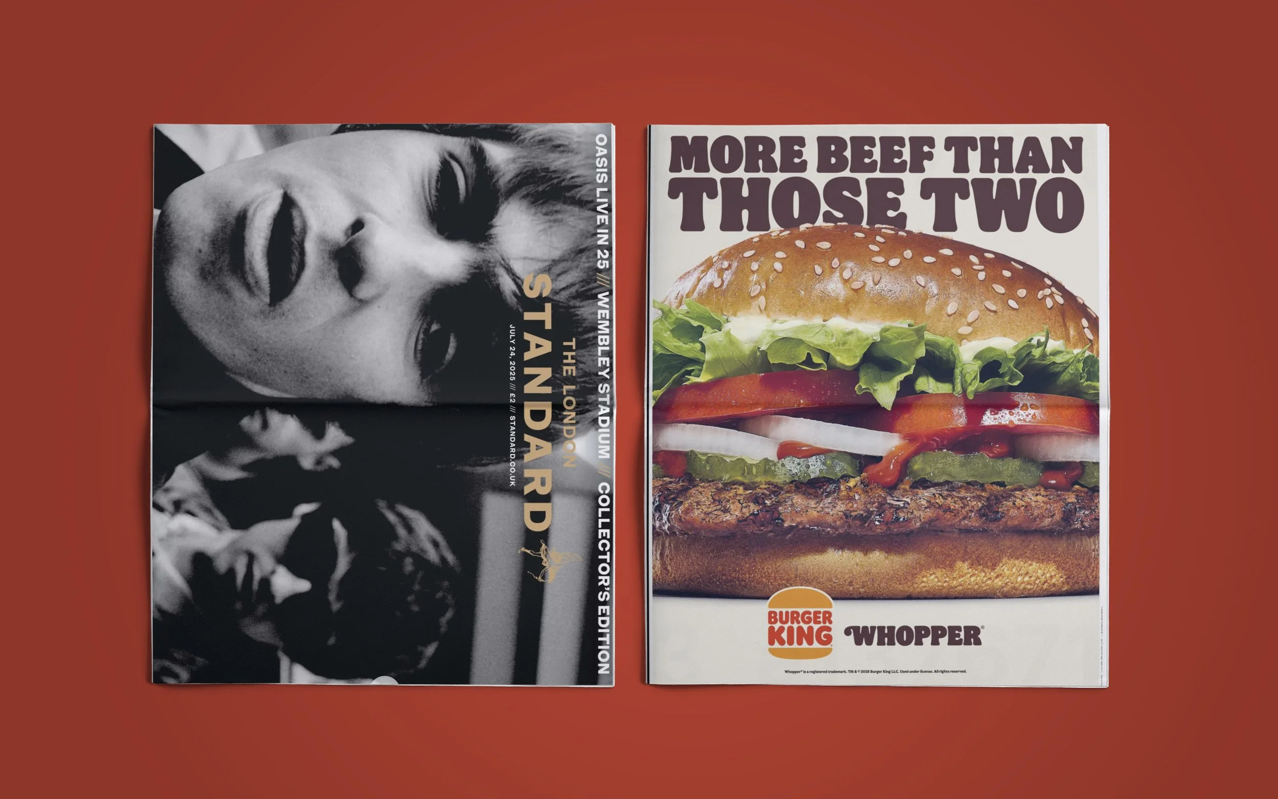 burger king: oasis-levels of beef CHALLENGE: Tell Oasis fans how beefy the Whopper is.IDEA: We ran some cheeky tactical ads during their nights at Wembley, tapping into Liam & Noel’s beef with each other and Blur.